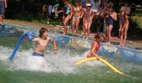 Dnes nejprve některé dívčí oddíly dychtivě rozmotávaly batikované věci, aby viděly, jak se jim to podařilo. Od jedenácti hodin probíhaly u bazénu vodní soutěže, kdy bojovala děvčata proti chlapcům. Rychlošípáci připravili vodní běhací štafetu. Vyhrála v celkovém součtu děvčata. Poté Bratrstvo připravilo cákandu. I v té nakonec vyhrála děvčata. Aby toho nebylo málo, děvčata a chlapci si to rozdali ve vodní bitvě za pomocí waterballů. Jako třešnicku na dortu si vychutnali chlapci z posledního oddílu vodní lyže, které sami poháněli.