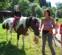 Dopoledne část oddílů se povozila na koních. Další vyráběly masky a jiné batikovaly. Také se děti průběžně osvěžovaly v bazéně. Nezapomněly ani na sport a pohyb.