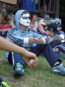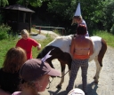 Dopoledne část oddílů se povozila na koních. Další vyráběly masky a jiné batikovaly. Také se děti průběžně osvěžovaly v bazéně. Nezapomněly ani na sport a pohyb.